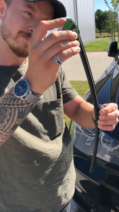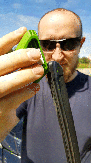 Fold up the wiper and clean it thoroughly with the sponge that is included in the delivery. Push the ECOCUT pro onto the wiper lip and trim wipers with an even pull. That´s all!